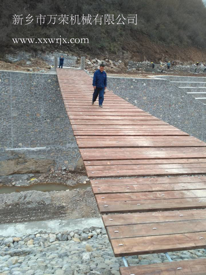 此橋?yàn)槟举|(zhì)吊橋,由混凝土基礎(chǔ)、承力鋼絲繩、防腐木板等部件組成,通常吊橋需要先做基礎(chǔ),基礎(chǔ)凝固后拉承力鋼絲繩或架吊索,最后鋪設(shè)橋面和護(hù)欄。由于木板吊橋常年在外經(jīng)受日曬雨淋,現(xiàn)在用作戶外使用木板吊橋都會(huì)做一些防腐處理,這就是我們所說(shuō)的防腐木吊橋。防腐木吊橋工程多采用專用的木材防腐劑,經(jīng)過(guò)這種防腐加工的防腐木吊橋,是達(dá)到環(huán)保標(biāo)準(zhǔn)的,其危害性大大降低,而且是在室外使用,空氣流通性好,所以大家完全不用擔(dān)心防腐木吊橋會(huì)有影響健康的問(wèn)題。